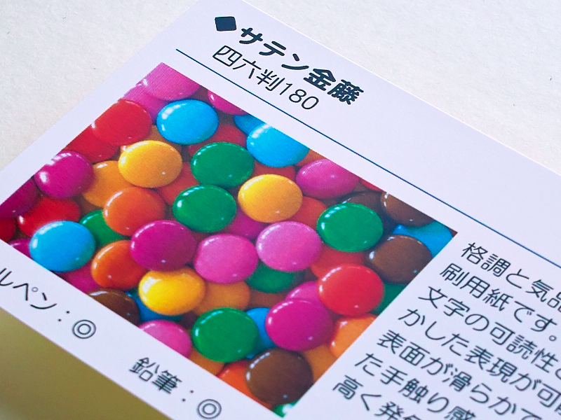 | 紙質 | ★上品な質感が特長の高級紙。 やや青みがかった白色で表面の光沢は抑えられており、さらさらした上品な質感が人気です。 落ち着いた雰囲気のある高級紙です。 |