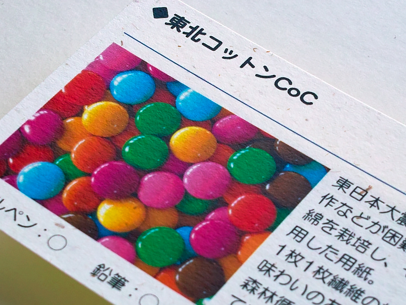 | 紙質 | 東日本大震災の津波被害で稲作などが困難になった農地で綿を栽培し、その綿の茎を使用した用紙。 1枚1枚繊維の規模が異なり、味わいのある風合いです。森林循環紙としても認証されています。 |