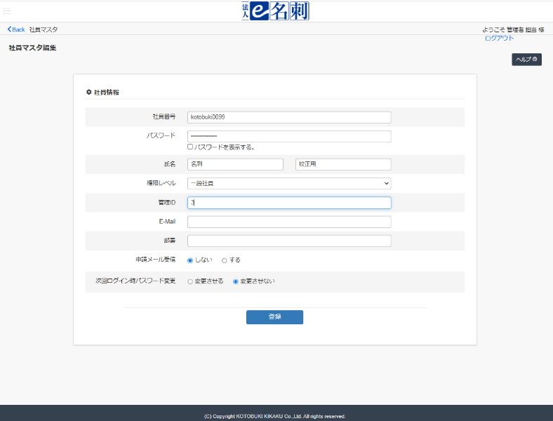 一般社員が、自分の社員番号・パスワードでログインし、名刺データを作成・編集します。