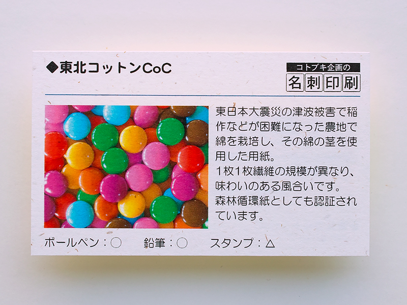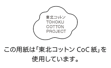 | 紙質 | 東日本大震災の津波被害で稲作などが困難になった農地で綿を栽培し、その綿の茎を使用した用紙。 1枚1枚繊維の規模が異なり、味わいのある風合いです。森林循環紙としても認証されています。 |