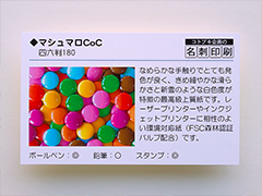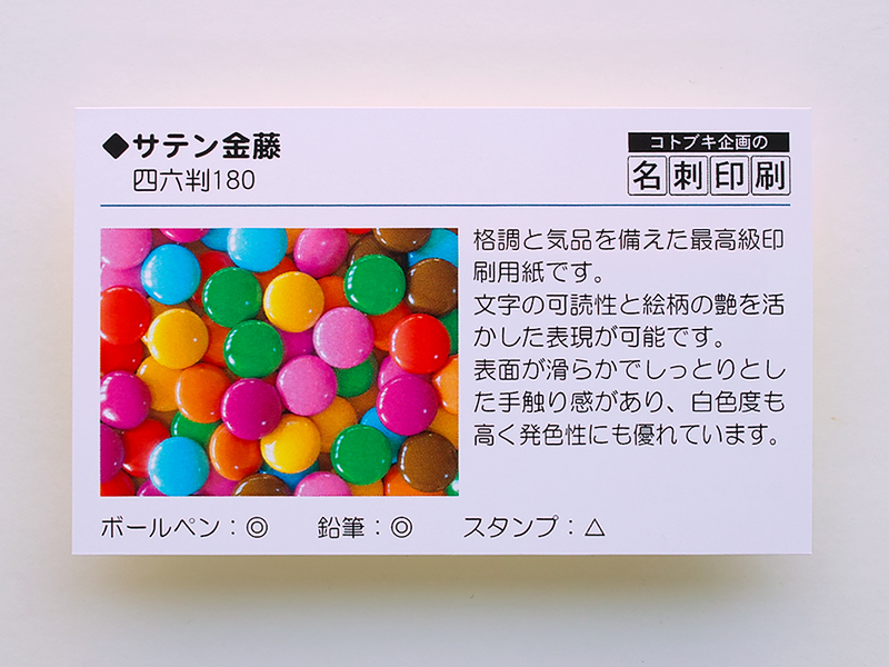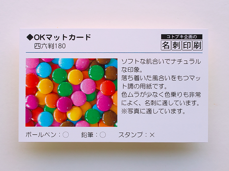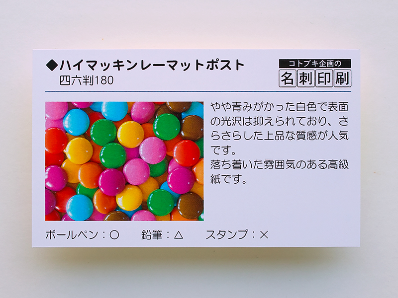 落ち着いた風合いをもつマット調の用紙です。色ムラが少なく色乗りも非常によく、名刺に適しています。 ※写真に適しています。 |