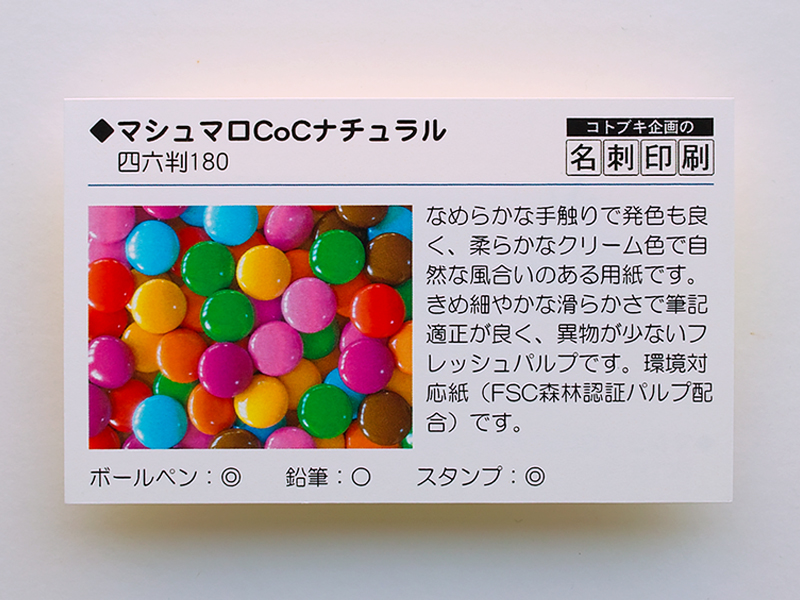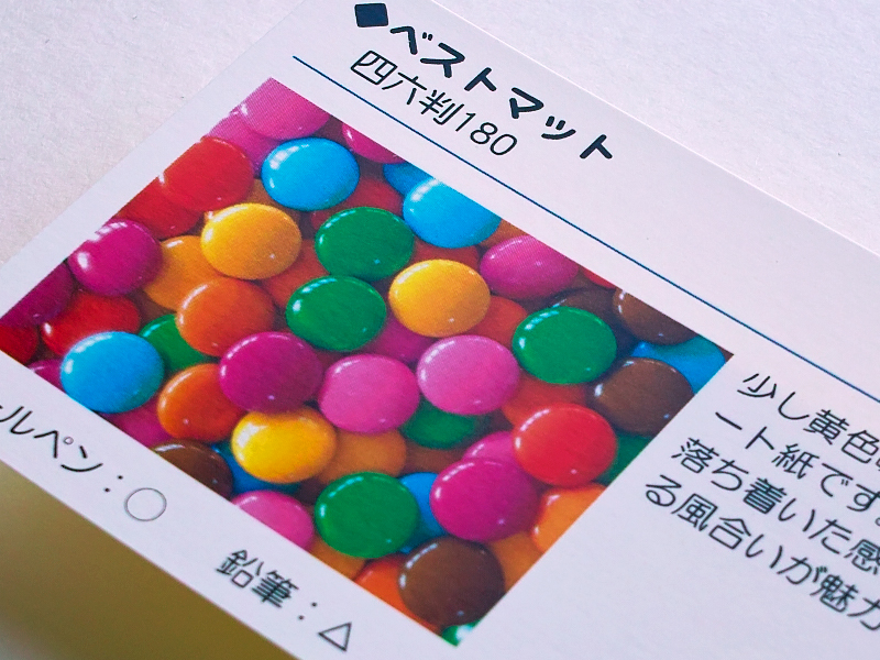 | 紙質 | 淡いクリーム色でマット系(艶消し)の用紙です。しっとりとした質感、滑らかな手触りで落ち着いた雰囲気があります。森林循環紙に認証されています。 | |||||