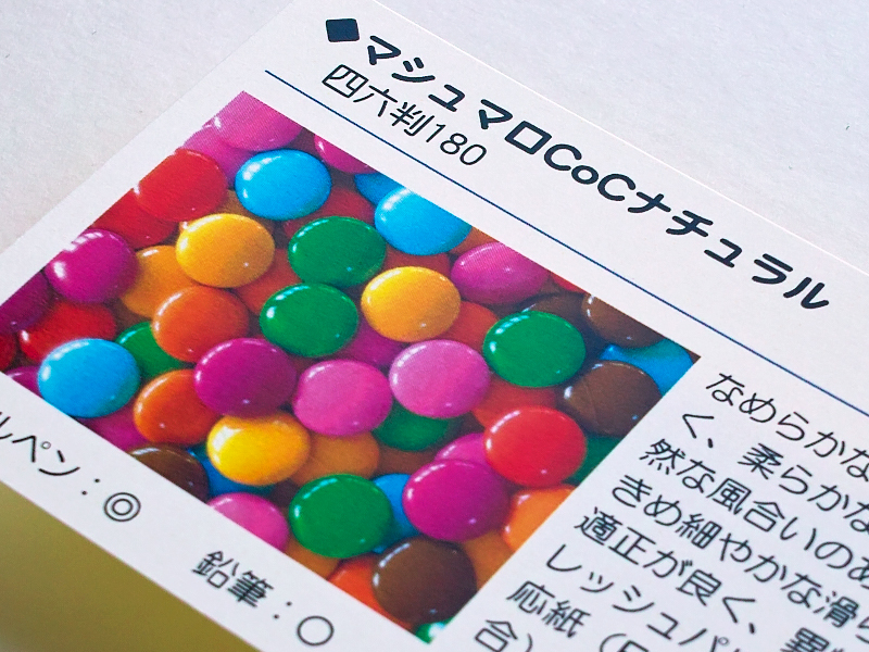 | 紙質 | 表裏ともコートされていないパルプ100%の非塗工紙です。 コート紙と比べコシも強く、筆記適正が高いので水性ペンなどでも書き込みやすい紙です。 |