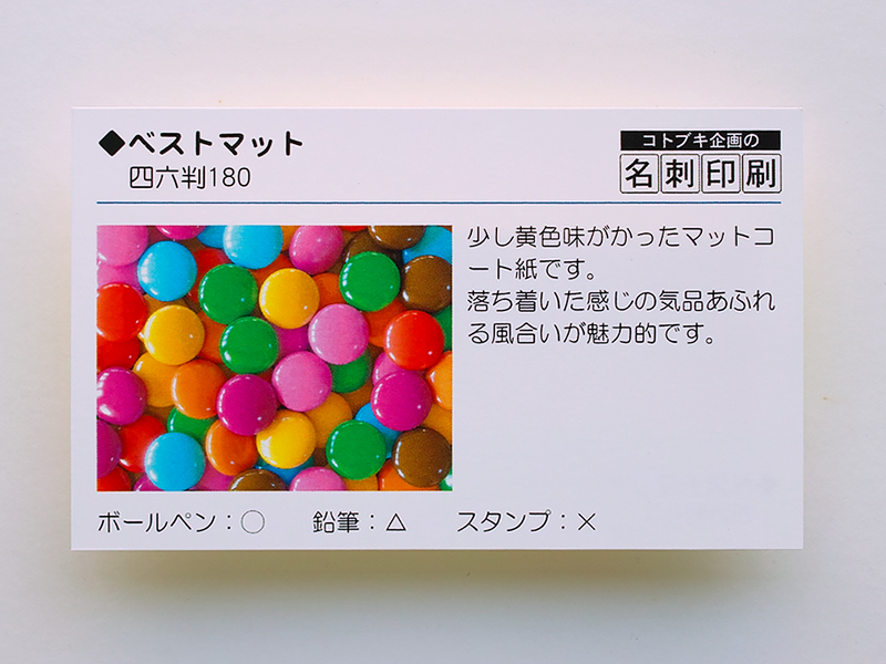 | 厚さ | 180kg | 紙の色 | ソフトな肌色でナチュラル | 紙の種類 | マットコート | ![]() ![]() ![]() |