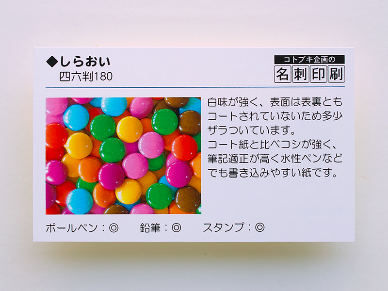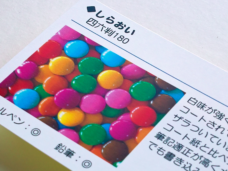 | 紙質 | 白味が強く表面は表裏ともコートされていないため、多少ざらついています。 コート紙と比べコシが強く、筆記適正が高く水性ペンなどでも書き込みやすい紙です。 | |||||